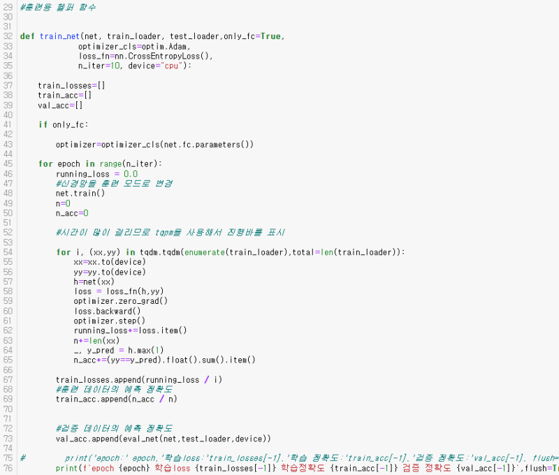 사전 학습이 끝난 pre-trained 모델을 불러와야 한다.이 책에서는 ResNet18 이라는 모델을 불러왔다.(이 모델은 출력 선형 계층을 fc 라는 이름으로 가져온다.) 이미지의 특징 추출이 이미 되어 있는 ResNet 18의 CNN 부분을 학습 과정에서 최적화가 되는 것을 방지 하려면 이 모델의 출력 선형계층을 제외한 나머지 파라미터들을 미분 대상에서 제외해야 한다. 그대로 이미지를 넣고 특징이 추출되어 flatten 된 것만 받아 그 이후의 다층 신경만 부분만 control 해야한다. fc에 새로운 선형계층을 설정하는데, 우리는 브리또와 타코를 분류할 것이므로 출력 차원을 2로 설정(타코vs브리또 분류문제를 풀거기 때문에)이렇게 하면 마지막 선형계층만 미분 대상이 된다.