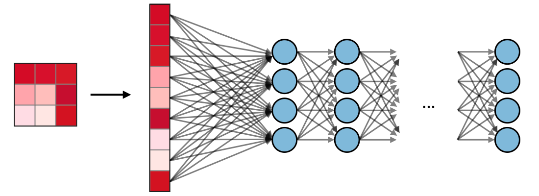 빨강 matrix가 step 2의 결과라고 하면 그 옆에 빨강 막대가 flatten 된 결과이다. 이 상태에서 다층신경망을 통과하여 우리가 원하는 문제를 풀 수 있도록 모델을 설계하면 된다.