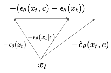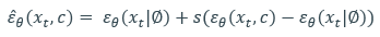 이제부터 리뷰를 하는 중에 Classifier free guided를 'CF'라 표기하겠다. CF는 말그대로 분류기가 없는 diffusion model이다. 바로 전에 소개한 guided diffusion 같은 경우엔 diffusion 학습 모델과, 별도로 label-data pair가 학습된 classifier가 필요했다. CF는 diffusion model 1개로도 classifier의 guide를 받은 효과를 내겠다는 아이디어다.[2] 우리는 DDPM에서 mean을 epsilon으로 표현했었다. 그래서 guided diffusion에서 현재 우리의 상황을 표현한 수식은