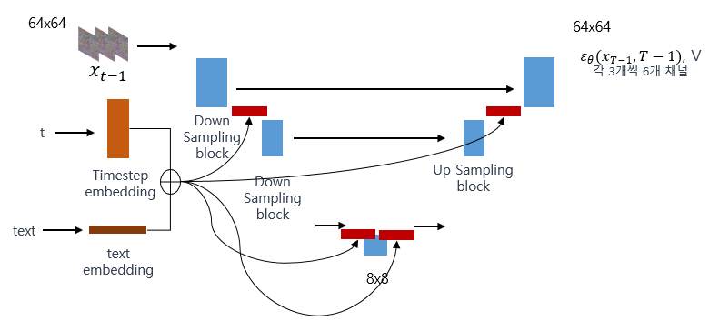 대망의 학습 부분을 읽으려고 논문을 봤는데 처음에는 아키텍쳐도 없어서 뭔 내용인지 전혀 감이 안왔다. 결국 reference를 따라다니면서 하나씩 찾을 수밖에 없었다. 논문 리뷰를 하면서 이런 과정이 제일 힘든 것 같다. training 을 이야기 하면서 저자는 갑자기 ADM을 채택했다고 한다. 도대체 ADM이 뭔지 알 수 없어서 reference를 찾아본 결과 [4]에서 나온 개념인데, ablated diffusion model이라는 뜻이다. 논문[4]에서는 이미지를 생성하는 diffusion model을 U-Net을 이용하여 좀 더 성능이 잘 나오도록 파라미터 튜닝을 했다. 그 모델이 바로 ADM이다.본 논문의 contribution이라고 생각되는 부분이 지금부터 나오는데, ADM은 x_(t-1) 시점의 데이터와 time embedding을 통해 노이즈와 분산을 추정했다. 본 논문에서는 text-conditional image generation을 가능케 하기 위해 text를 모델이 학습할 수 있도록 text embedding을 추가했다.
