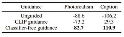 사람이 봐도 CF guide를 받은 모델에서 생성된 이미지가 CLIP guide 보다 photorealistic하고, text caption이 더 좋았다고 평가되어지고 있다.