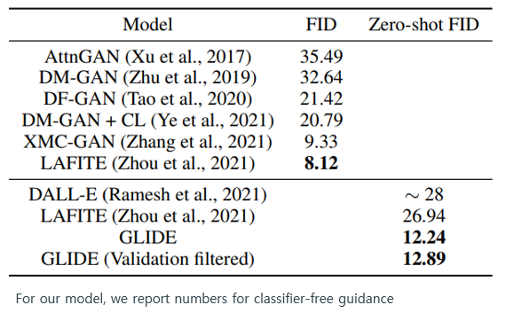 P/R, IS/FID trade off 에서는 CF가 최적이었지만 CLIP score/FID trade off에서는 CLIP guide가 최적이었다. MS-COCO image가 학습된 다른 GAN 기반 모델과의 비교에서 GLIDE가 이 데이터셋에 대해 명확하게 학습하지는 않았지만