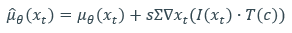 좌항에 mean_theta가 우리가 원래 추정한 mean 값이다. 여기에 1보다 큰 S에 잘 학습된 분류기(p(c|x))의 log likelihood를 x_t에 대해 미분한 값을 곱한 값을 mean_theta 에 더하여 guide를 주는 모습을 볼 수 있다.여기서 c는 이미지 classifier에서는 이미지의 label이고, text-condition generation에서는 이미지에 대응 되는 text이다. 즉 이 논문의 목적에 비유하자면 x는 이미지, c는 text인 pair 데이터에 대해서 학습을 미리 시킨 것이 p(c|x)라는 모델이 되는거고여기에 log를 씌우고 x에 대해 미분하게 되면 얘는 통계학에서 score가 되는 것이다.[1]