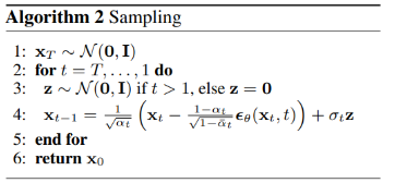 forward process에서 얻은 결과인 x_t와 시점 정보 t를 MODEL에 넣고 x_t와 x_(t-1) 사이에 추가된 노이즈인 epsilon_theta를 구해서 저어기 algorithm2에 넣으면(alpha는 하이퍼파라미터여서 이미 알고 있고 sigam는 alpha를 통해 유도할 수 있음) 노이즈가 조금 제거된 x_(t-1)을 얻을 수 있다.