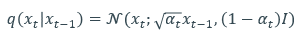 수식에서 q는 x_(t-1) 이미지에서 노이즈가 입혀진 x_t 이미지의 probability를 의미한다. 오른쪽 term을 보면 x_(t-1)에 root alpha_t 만큼 곱하는데 이는 root alpha_t 만큼 x_(t-1)의 정보를 의미하고 (1-alpha_t)에 1을 곱한 것은 (1-alpha_t)I 만큼의 노이즈를 더하겠다는 의미이다. 이렇게 생성된 x_t는 정규분포를 따른다. t=0 부터 t-1까지 반복하면 우리는 완전한 noise distribution을 얻는다.
