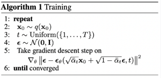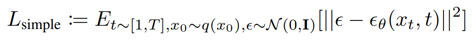수식에서 p의 의미는 x_t를 가지고 있다는 조건하에 x_(t-1)의 발생 확률을 의미한다.(근데 파라미터 theta가 있는)우리가 추정해야할 것은 각 시점 사이의 추가되어지는 noise의mean 값과 variance이다. DDPM에서는 이러한 gaussian distribution의 mean 값을 찾는 문제를 noise를 예측하는 문제로 수식을 조금 유도하여 바꿔버렸는데, 이에 대한 자세한 과정은 reference에 경로를 남겨두겠다.(꼭 보는거 추천) 자세한 설명을 달지 않는 이유는 지금 GLIDE 논문에 대한 리뷰를 하고 싶은데 deep하게 설명을 해버리면 재미가 없을 것 같다. 따라서 predict noise와 true noise 간의 MSE loss를 training object로 설정하여 diffusion model의 forward process를 수행할 수 있다. 논문에 나와있는 Algorithm 1과 다음의 수식을 참고하면 쉽게 이해할 수 있다.