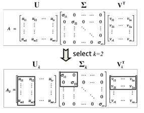 1.$U: $단어(m) - 토픽(r) 간의 유사도, 즉 행렬에서 열에 해당하는 것은 r개의 토픽들이며 행에 해당하는 것은 m개의 단어들이다. 각 단어가 어떤 토픽과 얼만큼 연관이 있는지 알 수 있다.