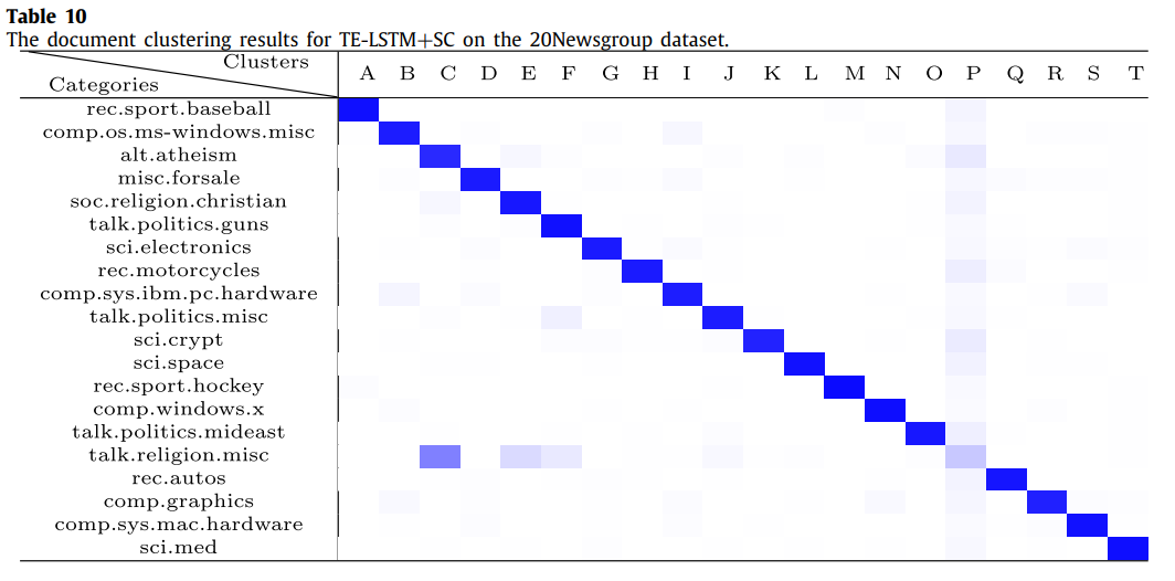 제안한 모델의 군집화 결과가 더 뚜렷하다. 각 클러스터에 카테고리들이 비교 모델인 seq-LSTM 보다 안겹치게 할당되었기 때문이다. table 10에서 클러스터 C는 약간 겹치는 것을 볼 수 있는데, 이 실험은 개인적으로 매우 의미가 있다고 생각한다. 그 이유는 상관관계가 있는 두 단어 "religion"과 "atheism" (종교와 무신론)를 벡터로 적절히 표현하여 표현된 벡터 역시 서로 밀접한 관계를 유지하고 있으므로 제안한 모델이 문서 표현을 잘 한다는 것이 증명되었기 때문이다.