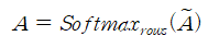 모든 시점의 hidden state에 대해 attention weight를 계산하면 attention 수식 2와 같다. 주목할 점은 계산된 $\widetilde{A}$는 각 원소들이 0에서 1사이 값이지 $\widetilde{A}$matrix의 전체 합이 1이 아니다. 따라서 attention 수식 3과 같이$\widetilde{A}$행렬에 Softmax 함수를 취하여 Scaling을 해준다.