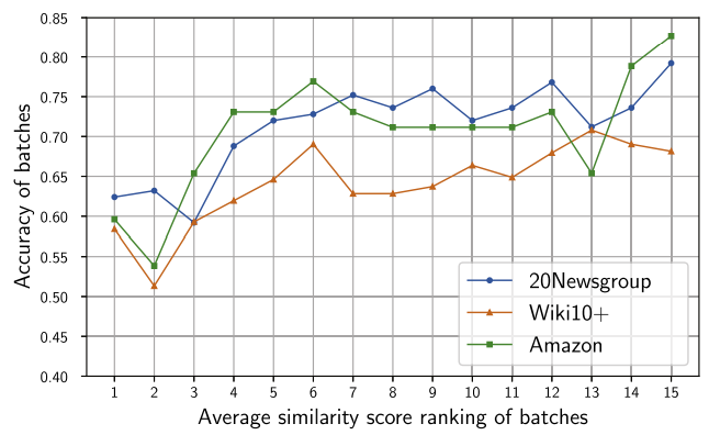 또한 저자는 Topic similarity constraint의 효과를 검증하기 위해 Test data를 topic similarity score에 따라 내림차순으로 정렬하고 동일한 크기의 15개 배치로 나누어 평균 분류 정확도를 plot 했다.(배치의 순서가 뒤쪽일 수록 토픽간 유사도가 낮다.)