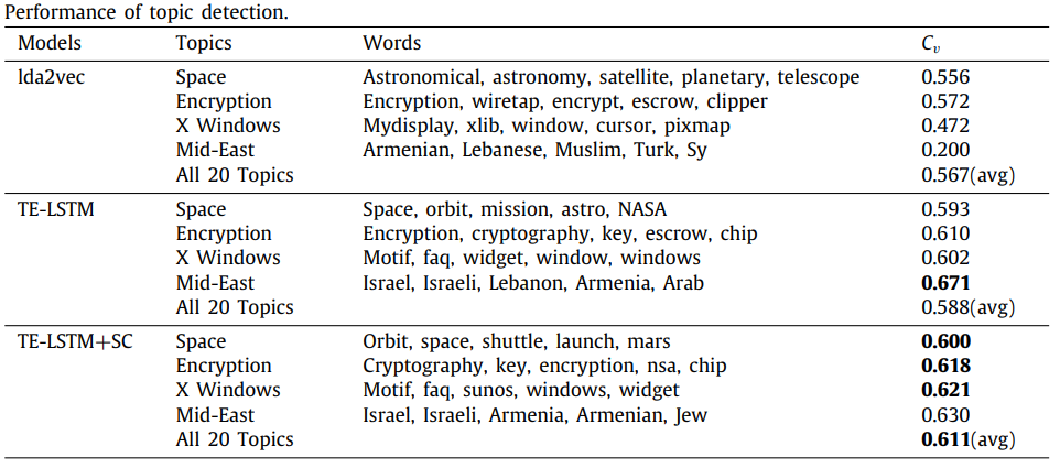 토픽들은 의미적으로 비슷한 단어들의 군집을 통해 파악할 수 있다.(사용자가 임의로) 저자는 비교모델로 word2vec과 LDA가 결합된 모델인 LDA2vec에서 실혐했던 것과 같은 방식으로 제안 모델에 대해서 실험하여 두 모델을 비교했다.