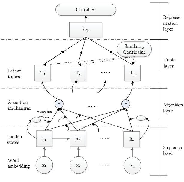 논문에서 제안한 모델은 Sequence modeling layer, attention modeling layer, Topic layer, Representation layer로 이루어져있다.