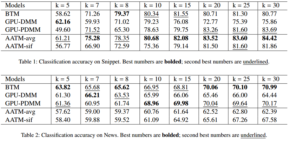이 실험은 훈련과정에서 얻은 $T$행렬을 가지고 문서를 분류하는 task를 수행하는 실험이다. 실험결과는 다음과 같다. 여기서 K란 토픽의 갯수 이며, 제안된 모델인 AATM의 경우엔 오토인코더 구조에서 latent vector의 차원 수이다.