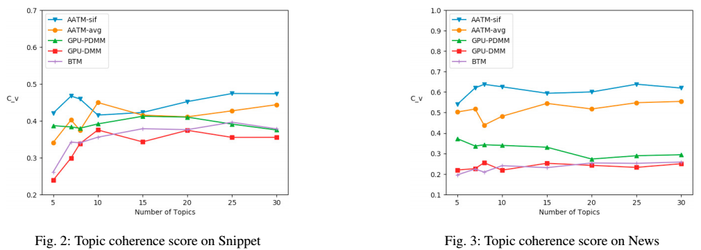논문에서 제안 모델의 성능을 비교하기 위해 비교 모델로 BTM, GPU-DMM, GPU-PDMM을 사용했다. 각각의 모델은 short text에서 토픽을 탐지하는 모델로써, BTM의 경우엔 bi-gram을 사용하여 토픽을 탐지하는 모델, GPU-DMM, GPU-PDMM은 각각 디리클레, 포아송 분포를 가정한 통계적 모델로 간단히 설명하고 있었다. 실험을 위해서 단어 임베딩 모듈로는 Google-News가 사전 학습된 임베딩 모델을 사용했다고 밝히고 있으며 AATM에 학습시킬 때는 위 데이터 셋을 fine tuning 했다고 한다.