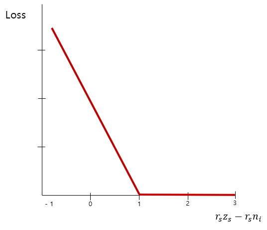 여기에서 만약 $r_sz_s - r_sn_i$가 1 미만의 값을 가진다면 해당 관측치에 대한 모델의 에러가 증가한다. $r_sz_s - r_sn_i$가 1 이상이라면 손실을 무시(=0)하고, 1보다 작으면 작을수록 손실 또한 크도록 유도한 것이 hinge loss형태의 본 Loss term 수식이 의미하는 바다.