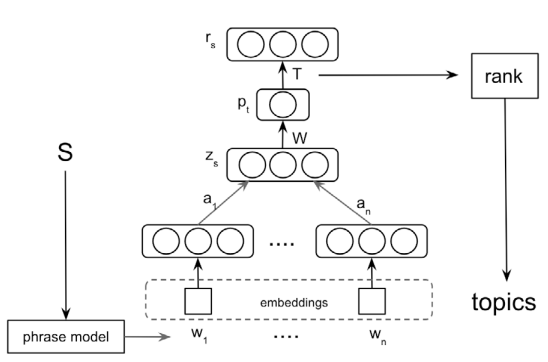 논문에서 제안한 모델 Attention-based Autoencoder Topic Model, 줄여서 AATM은 1) Phrase(구문) model, 2) Attention based Auto-Encoder, 3) Ranking model로 구성되어 있다. 그림 1은 모델의 전체 구조이다.