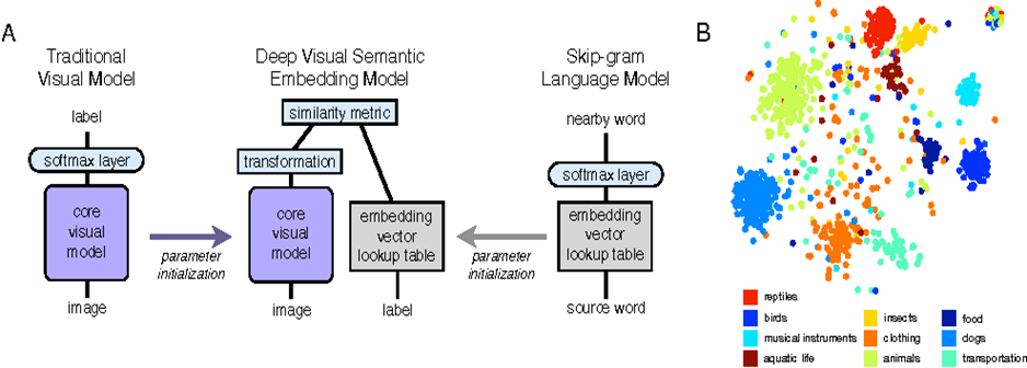 DeviSE는 모델을 훈련시킨 후 아예 새로운 호랑이 이미지와 호랑이를 설명하는 side-information을 함께 입력하여 비록 한 번도 호랑이를 본 적이 없지만 호랑이에 대한 의미를 내포하는 임베딩 값을 도출하였다.(zero-shot learning이 가능) 훈련과정에서 한 번도 본 적이 없는 데이터가 입력이 되더라도 임베딩 공간 상 클래스 간의 관계를 통해 올바른 클래스를 예측할 수 있었던 연구이다.