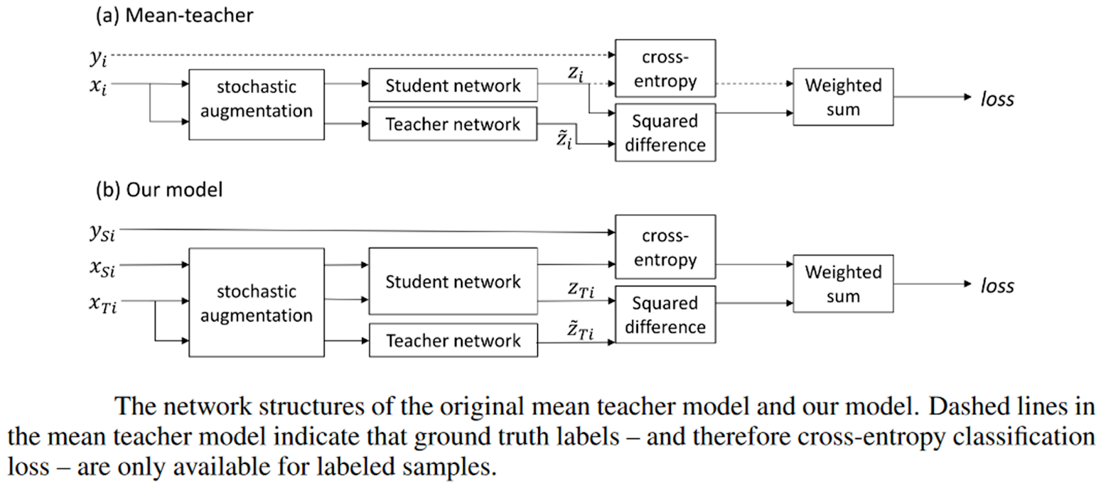 teacher network- student network 구조는 연구실 세미나때(knowledge distillation) 본적이 있어서 기억이나지만, DA에 적용된 사례는 잘 모른다. 이 논문은 teacher network의 가중치가 student network의 가중치의 지수 이동 평균(EMA)로 조정되는 것이 특징이다.(teacher와 student의 역할이 달라진건가..?)