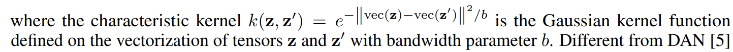 CNN layer의 feature vector를 bottleneck layer를 거처 일정 사이즈로 만들어 준다음, Target에서 나온 것과 Source에서 나온 것의 평균 사이의 거리를 최소화하는 방향으로 수행한다. (Minimize MMD), 이때 분포의 첨도 차이를 고려하기 위해 Kenel method를 사용하여 고차원으로 매핑하는 트릭을 사용했다.(가우시안 커널)