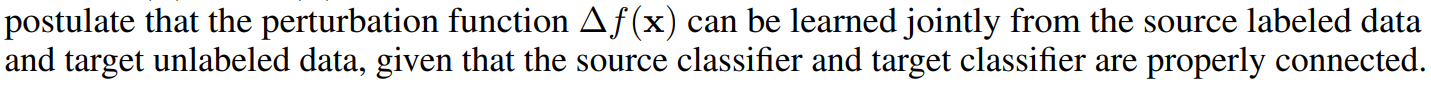 classifier adaptation의 가정은 source classifier($f_{s}(x)$)와 target classifier($f_{t}(x)$)가 오직 small perturbation(작은 변동)에 의해 다르다라는 것이다. 따라서 small perturbation을 모델링할 수 있는 $\Delta f(x)$ 를 학습하여 두 classifier 간의 discrepancy를 모델링했다.