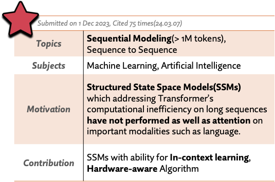 드디어 본 논문입니다. 시퀀스 모델링의 근본적인 문제는 context를 smaller state로 잘 압축하는 것에 있고, Trade-off 문제를 가지고 있습니다. 예를들어 Attention은 effective하나, inefficient 합니다. 그 이유는 inference를 위해 전체 context(i.e. K, V cache)를 메모리에 모두 저장하고 있어야 하기때문입니다.