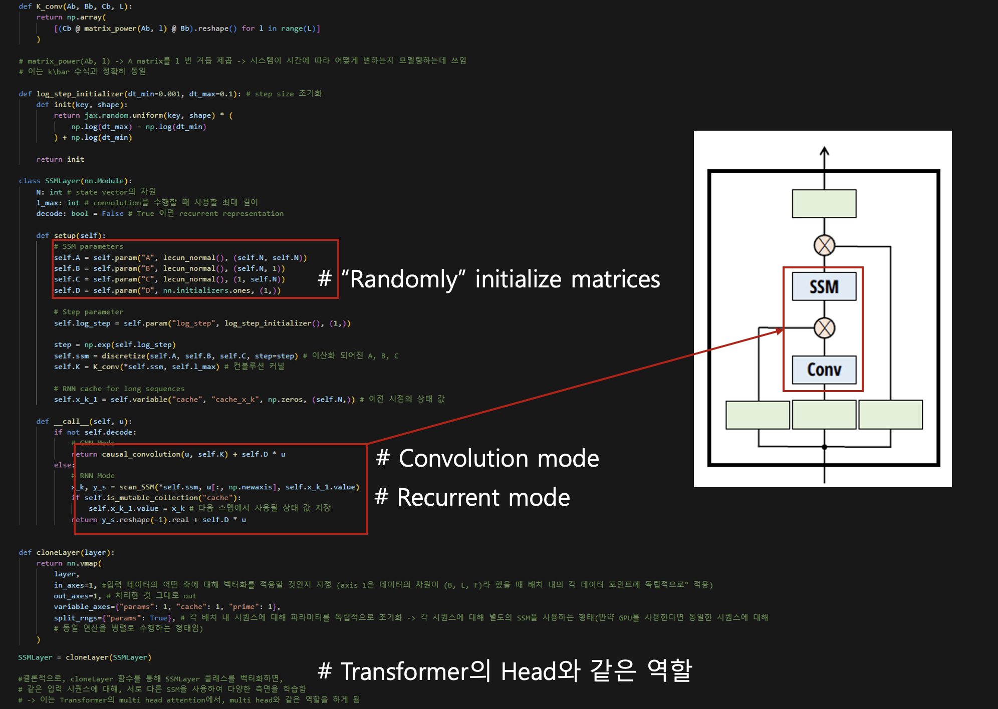 여기까지나 SSM에 대한 기본적인 설명입니다. 아직, 파라미터 A,B,C를 업데이트 하는 부분은 없고, 모두 고정되어 있습니다. 처음 여기까지 공부를 했을 때 도대체 학습은 어떻게 하는 것인지 정말 모르겠더라구요. 따라서 Reference에 달아둔 Annoted S4라는 제목을 가진 저자의 블로그를 참고하여 SSM이 어떻게 딥러닝 아키텍처에 적용되는지 코드를 통해 살펴보았습니다.