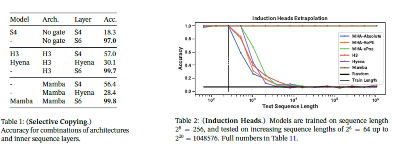 오른쪽은 시퀀스의 길이가 길어짐에 따라 Induction heads Task 성능이 어떻게 변하는지를 보여줍니다. 의심이 들 정도로 Mamba 성능이 압도적이네요..