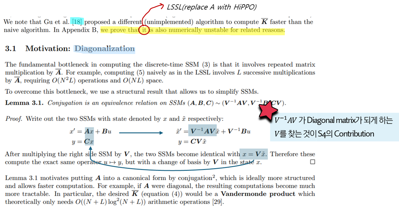HiPPO로 deepSSM의 장기 의존성 문제를 해결했음에도, 여전히 남아 있는 문제는 matrix A를 시퀀스 길이만큼 거듭 제곱하는 것에서 계산 효율성이 매우 낮다는 것이었습니다. 실제 위에서 kernel representation의 kernel filter를 보면 시퀀스 길이 만큼 A를 거듭제곱하는데요, 행렬의 반복적인 곱으로 인한 계산량을 줄이기 위해서 간단히 생각할 수 있는 것은 A를 diagonalize하는 것입니다.