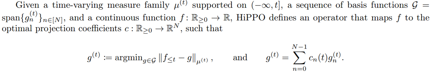 여기서 생각할 수 있는 것은, 우리는 입력값 $f$를 알고 있고, $\mu$도 정의해줄 수 있고, $c(t)$도 구할 수 있기 때문에, matrix A, B를 구할 수 있습니다. 이러한 matrix는 전체 입력을 잘 복원하도록 하는 계수로 추정된 matrix기 때문에, 전체 시퀀스를 잘 기억할 수 있는 A, B가 되고, (4)에서 식은 SSM 형태를 나타내고 있으니 A, B를 구해서 넣어주면, 전체 시퀀스를 까먹어 버리는 기존의 문제를 해결할 수 있다는 것을 알 수 있습니다.