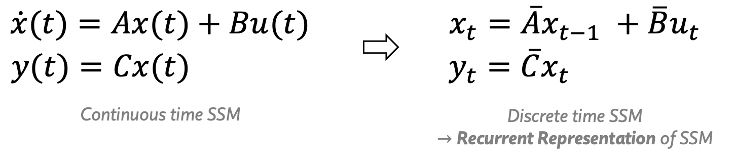 이제 연속 함수를 입력 받아 연속 함수를 출력(function to function)하는 것이 아니라, sequence-to-sequece로의 mapping으로 그 관점이 바뀌게 됩니다. 연속 시간과 다르게, 이산 시간에서는 현재 시점의 상태($x_t$)가 이전 시점($x_{t-1}$)의 상태의 영향을 받게 됩니다. 또한 Discrete time SSM의 형태는 RNN의 동작 구조와 매우 비슷하게(똑같나?) 생겼습니다. 따라서 이러한 형태를 SSM의 Recurrent Representation이라고 부릅니다.