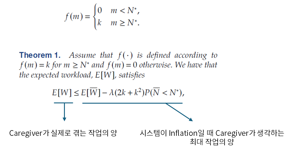 성과 측정 근사 과정 중에, 논문에선 우선 이전에 언급한 infliation function을 간단하게 $k$로 둔 특별한 케이스에 대해 살펴보고, 이를 일반화 하는 흐름을 갖습니다. 해당 과정의 증명 과정을 생략하겠습니다. 해당하는 아래 식을 이해해보면, 환자가 ICU 입원을 위해 기다릴 때, ICU bed가 Inflation 된 상황에서는 caregiver가 겪는 작업의 양이 매우 클 것으로 예상할 수 있는데, 만약 어떤 환자가 도착했는데 운이 좋게도 기다릴 필요 없이 ICU에 입원할 수 있다고 했을 때는 Caregiver가 실제로 겪는 작업의 양이 줄어들 수 있습니다.