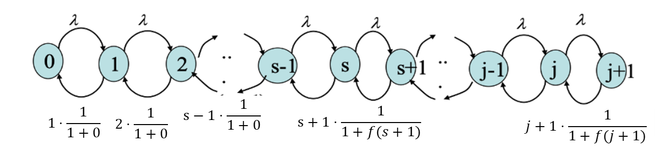 - 2. M/M(f)/S with $ρ =(1+k)λ$(즉., $ρ=λ/(μ=1/(1+k))$)