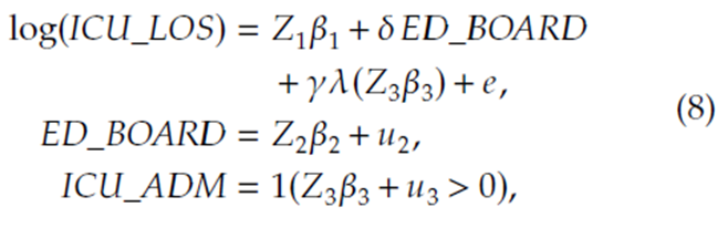 식에서 Z는 환자의 나이, 심각성, 입원 일 등이 될 수 있는 control variable이고, u는 가우시안 정규분포를 따르는 노이즈 항 입니다. 이러한 선형회귀식을 fitting하고 나면 회귀 계수 델타에 대한 해석을 통해 LOS에 미치는 영향을 알 수 있습니다. 만약 델타가 0보다 크다면 ED boarding이 일단 LOS에 영향을 미친다는 것을 의미하겠죠.