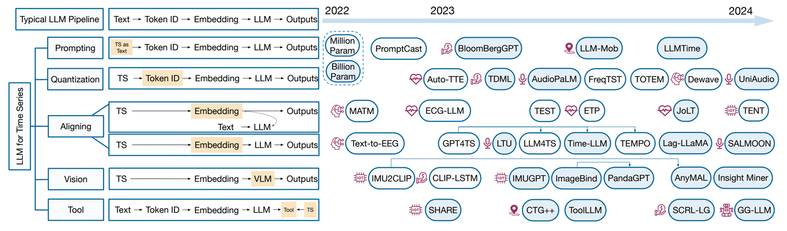 LLM은 현재의 task specific 한 tuning에 비해 시계열 예측을 더욱 일반적이고 효율적이며 효과적으로 접근 가능하게 하는 지름길을 제공한다. 관련 연구동향을 정리한 장표는 다음과 같다.