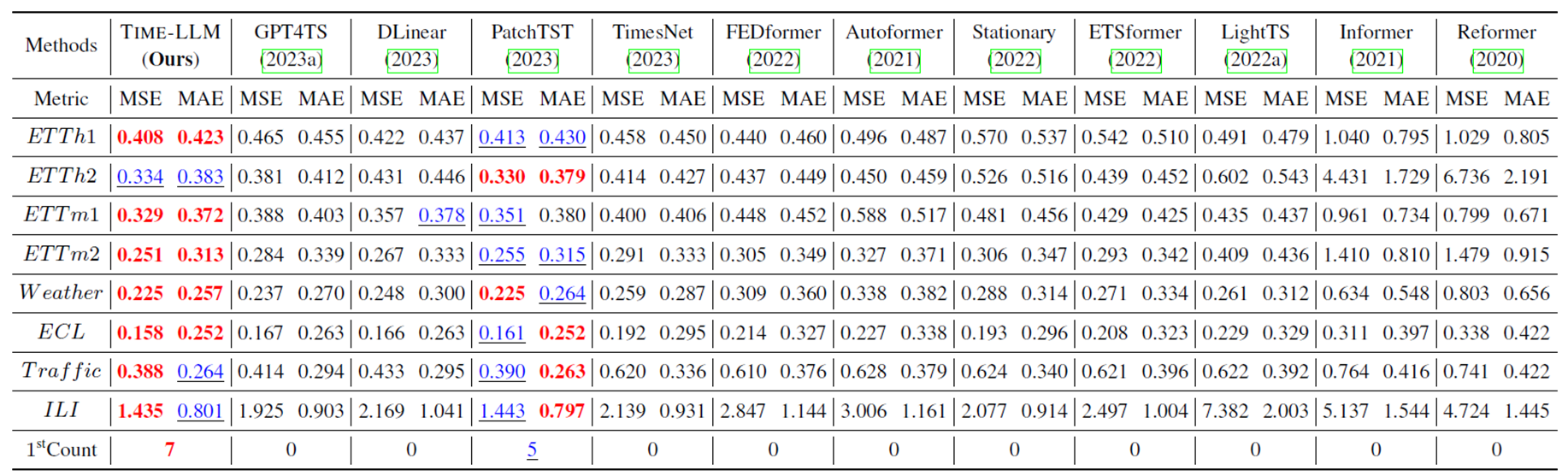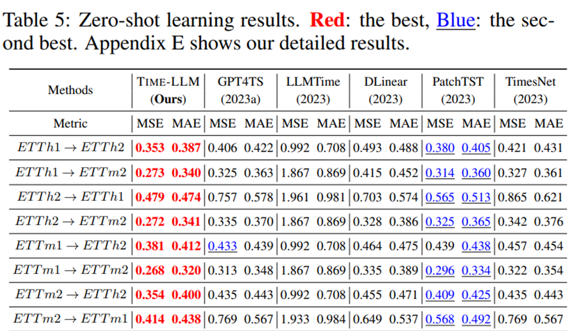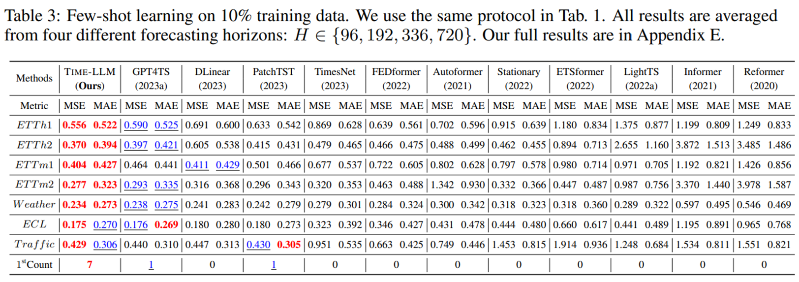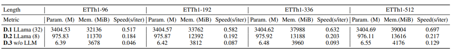 백본 LLM(대형 언어 모델)을 사용했을 때와 사용하지 않았을 때의 비교. 시계열 예측을 위해 LLM의 능력을 활성화하는 데 사용되는 학습 가능한 파라미터는 660만 개 미만이이다. 따라서 Time LLM은 매우 적은 수의 학습 파라미터를 가지고 있고, 효율적이라고 강조하고 있다.