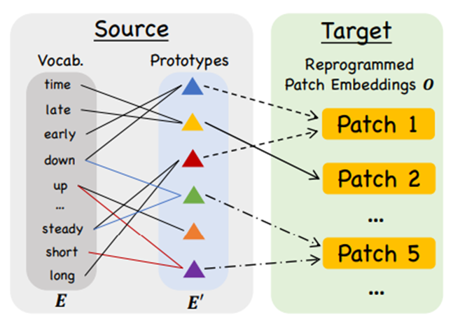 Patch reprogramming은 시계열 데이터가 자연어 모델이 이해할 수 있는 representation을 가질 수 있도록 하기 위해 수행된다. Reprogramming이라는 용어는 사전에 학습된 모델의 weight를 수정하지 않고 현재 가지고 있는 데이터를 잘 추론할 수 있게 하기 위해서 입력 데이터를 약간 수정하는 방식을 의미하는 것 같다. 즉 입력 데이터에 학습 가능한 노이즈를 추가하는 방식으로 학습된다.