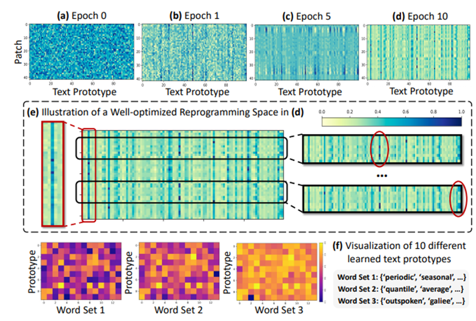 저자들은 전력 변압기 온도 데이터셋 중 하나인 ETTh1에 대해 case study를 진행하였다. 구체적으로, reprogramming의 과정을 깊게 알아보고자 하였는데요, 이를 위해 100개의 text prototype과 48개의 time series patch를 이용하여 히트맵을 학습이 진행됨에 따라 시각화 하였다.