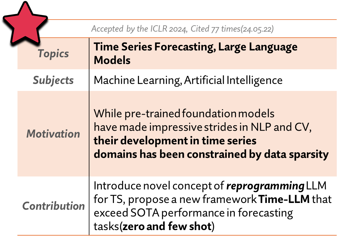 Time series foundation model이 NLP나 CV 분야에서 큰 성공을 이루었지만, Time series의 데이터 특성으로 인해 foundation model을 구축하는 것이 매우 어려운 문제이며, baseline 이라는 것이 아직 초기 단계이다. 본 논문은 LLM의 장점들을 time series에 잘 살릴 수 있는 분석 프레임워크를 제안하여 시계열 예측 task에서 SOTA 성능을 달성했다.