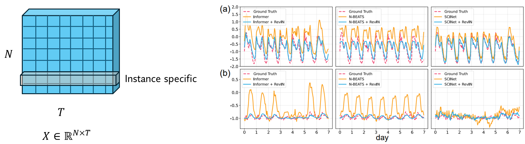 real time series는 non-stationary(비정상성)하기 때문에 time series forecasting model이 domain shift 문제를 겪을 수 있다. 이를 해결하는 정규화 방법으로 RevIN을 채택하였다.