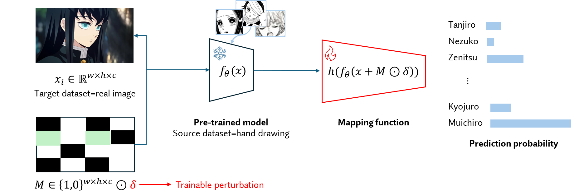 입력 데이터에 학습가능 한 파라미터 델타로 매개화 되는 노이즈를 첨가한 후 사전 학습 된 모델에 입력하여 분류를 수행한다. 이 과정을 거치게 되면 노이즈 term 자체가 사전 학습 된 모델이 입력 데이터를 이해할 수 있도록 바꿔준다.