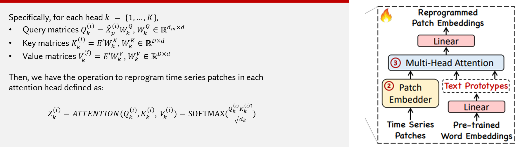이렇게 시계열 데이터를 reprogramming하면 언어로 학습된 LLM이 시계열을 잘 이해할 수 있다. patch reprogramming 과정과 cross multi head attention 과정에 대한 자세한 내용은 아래 그림과 같다. 여기서 쿼리는 patch embedding 벡터로 생성하고, key와 value는 text prototypes로 생성한다. (cross muli-head attention) (왜 이렇게 하지?)