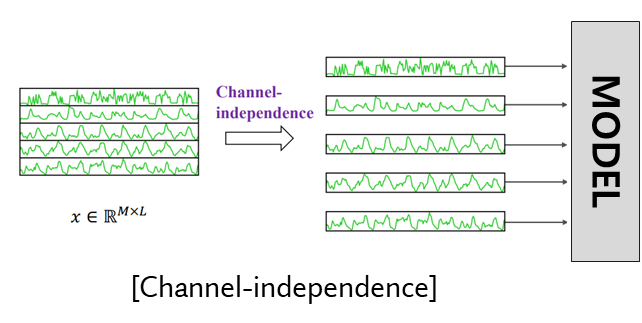 multivariate time series는 N개의 univariate time series로 분할되어 연속적으로, 개별적으로 처리된다. (channel-independence)