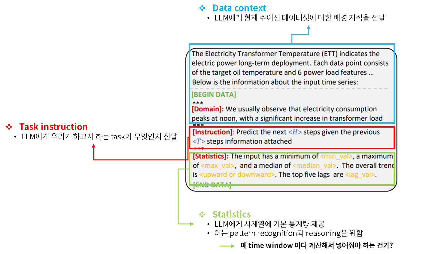 시계열 데이터를 단순히 reprogramming을 하는 것만으로는 LLM의 추론 능력을 극대화 할 수 없다. 따라서 일종의 접두사로서 입력 시계열 데이터에 대한 정보를 보충해준다.