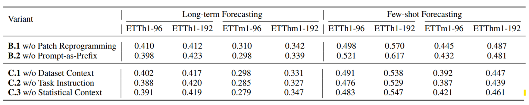 without patch reprogramming, prompt-as-prefix, data context, task instructionm statistical context(template 구성 요소들)