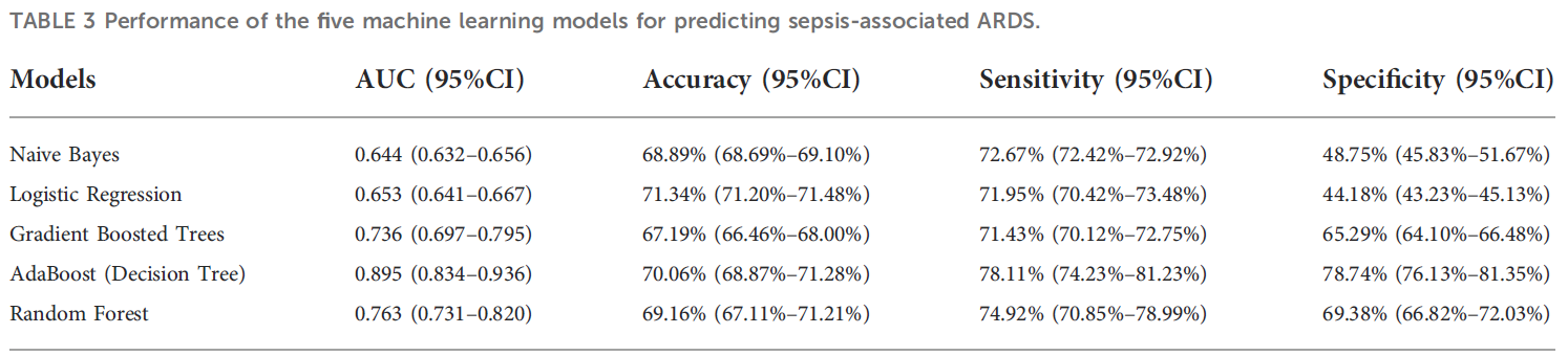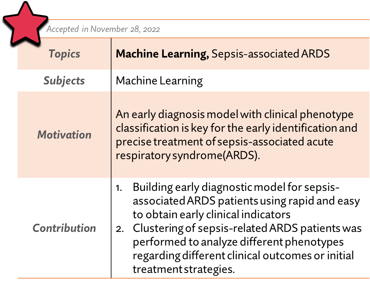 [1] Bai, Yu, et al. "Using machine learning for the early prediction of sepsis-associated ARDS in the ICU and identification of clinical phenotypes with differential responses to treatment." Frontiers in Physiology 13 (2022): 1050849.