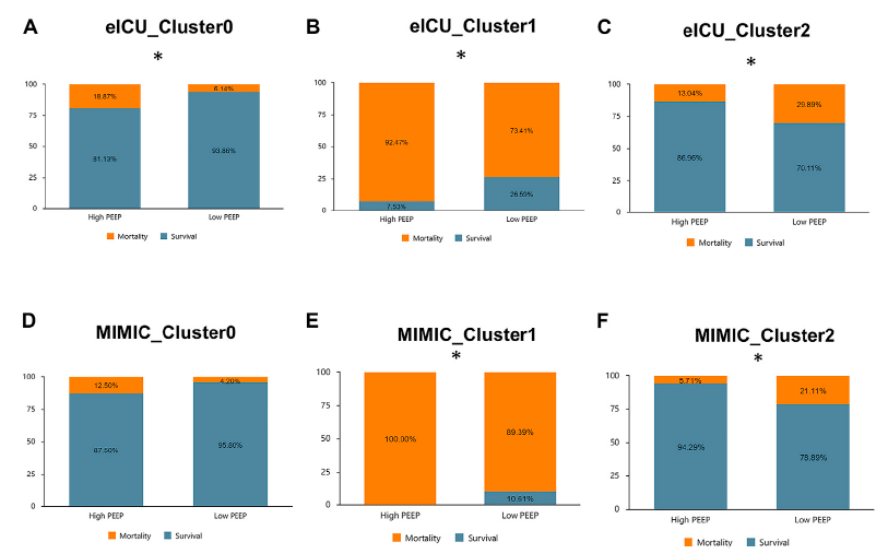 Cluster 1의 환자들은 상태가 가장 심각하며, 매우 높은 사망률을 보인다. 이들은 높은 PEEP을 견디기 어려울 수 있으며, 높은 PEEP이 주는 부작용이 이점보다 크다.