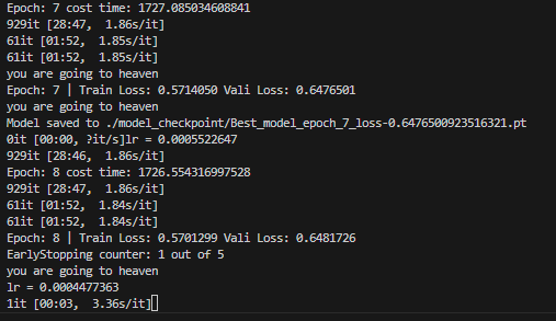 참고로 로그에서 "you are going to heaven" 은 best validation loss가 현재 epoch의 validation loss보다 클 경우 모델을 저장한다는 의미에서 나타내는 print 문이다. GPU는 2개를 multi로 작동하고 있었다. 일단 epoch 7에서 you are going to heaven이 2번 시간 간격을 두고 등장했고, 모델이 저장됬다.