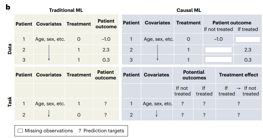 치료 반응과 같은 causal quantity은 일반적으로 'potential outcomes framework'에 기반하여 공식화된다. 이 프레임워크는 특정 치료법이 투여되었을 경우 가상적으로 관찰될 환자의 결과인 잠재적 결과를 개념화한다. 그런 다음 실제 적용 분야에 따라 다양한 causal quantity가 중요할 수 있다. 여기에는 다양한 치료법 하에서 두 잠재적 결과의 예상되는 차이를 정량화하는 치료 효과가 포함된다. 일반적인 치료 효과 선택은 두 가지 차원(그림 3b)을 따라 느슨하게 그룹화할 수 있다. 효과 이질성의 정도와 치료 유형이다. 특정 치료 효과를 선택함으로써 소위 추정량(estimand)을 정의하는데, 이는 인과 추론 ML 방법으로 예측해야 하는 causal quantity이다.