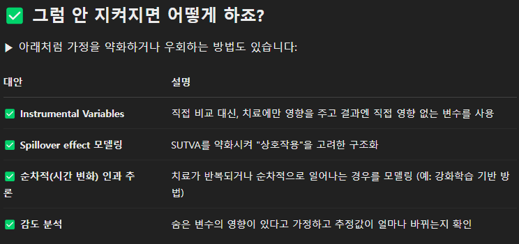 | SUTVA (일관성 & 비간섭) | '한 사람의 치료가 다른 사람의 결과에 영향을 주면 안됨' | 혼선 없이 개별 효과를 구분하려면 필요 |