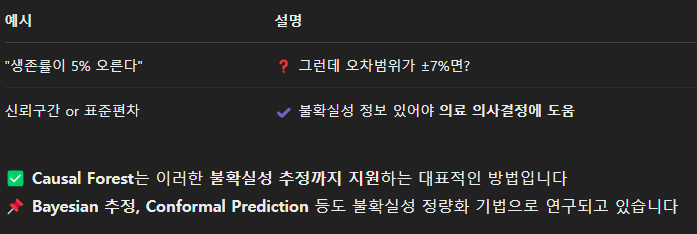 | Unconfoundedness (비교를 방해하는 숨은 요인이 없음) | '관측된 변수만으로 치료 결정이 설명돼야 함' | 숨은 요인이 있으면 결과가 왜곡됨 |